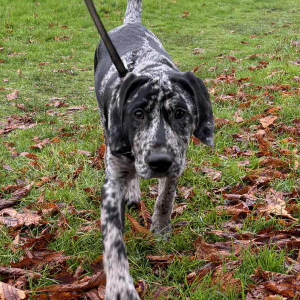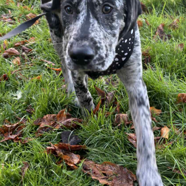 Bella is currently in foster with two Labradors and has been wonderfully friendly with them and every dog she’s met on walks. She loves to play and often jumps and mouths during playtime, so she’d do best in a home with either no other dogs or with an older, patient dog who can help teach her gentle play boundaries.