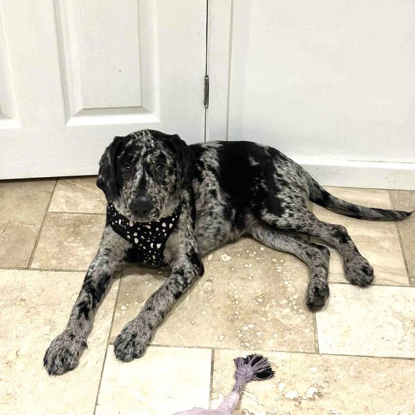 Bella adores people and is very affectionate — she can jump up and mouth when excited but will usually redirect to a toy when offered. Occasionally, she may mouth at jumper sleeves as she continues learning what’s appropriate to play with.